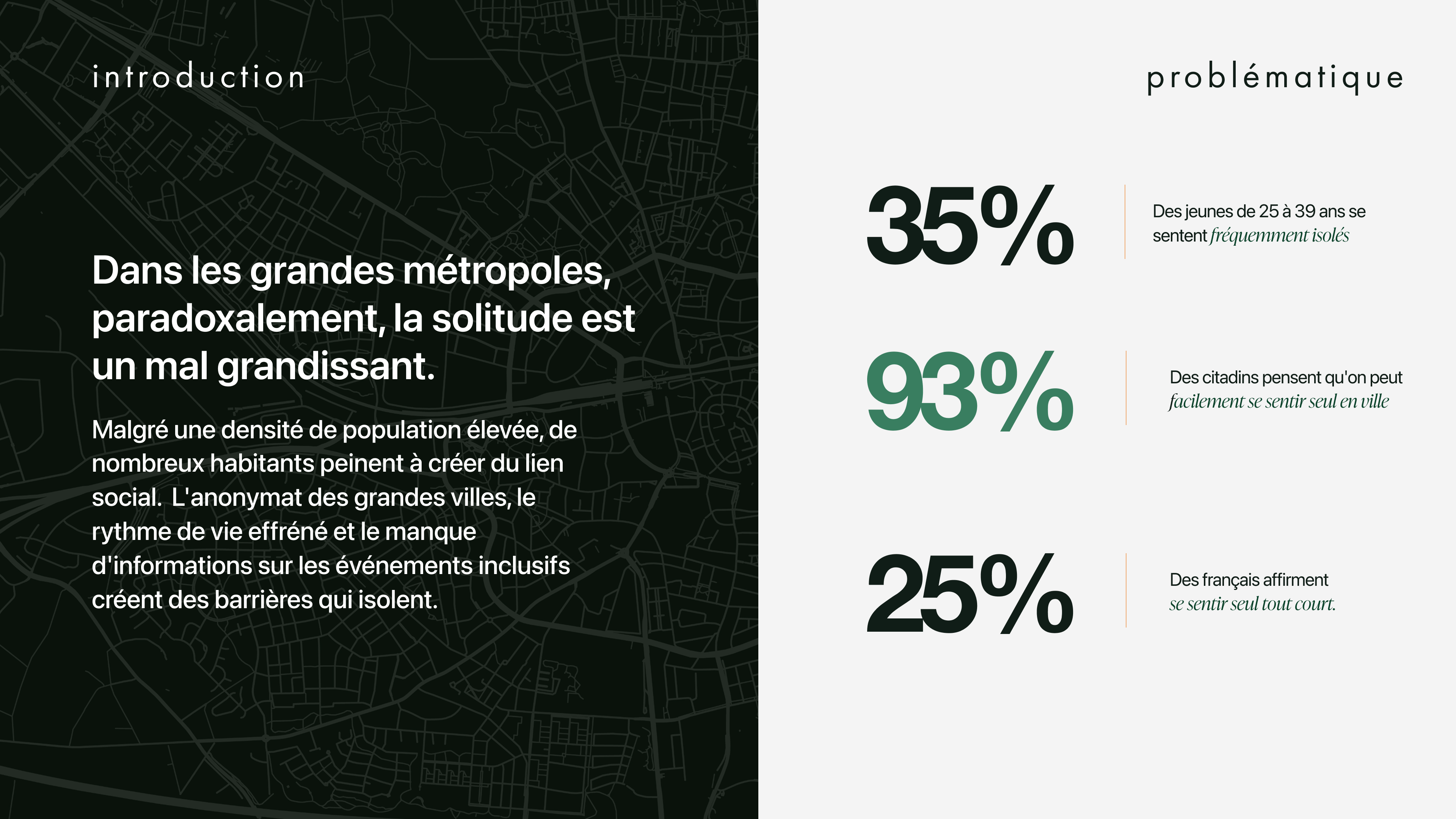 OpenHive répond à l'urgence de l'isolement urbain, causé non par le manque d'événements, mais par les barrières invisibles de l'anxiété sociale et de l'accessibilité non fiable.